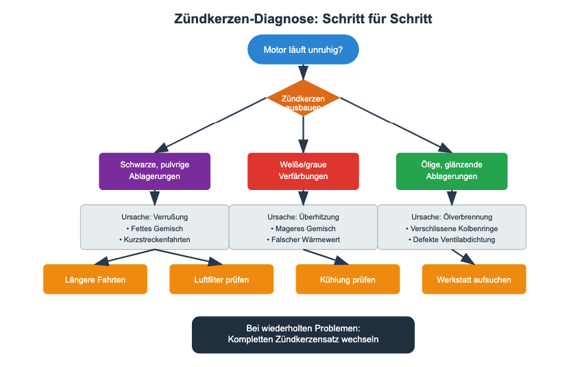 Die Diagnose beginnt oft mit der Sichtprüfung der ausgebauten Zündkerzen. Aber auch ohne Ausbau gibt es Anzeichen:
